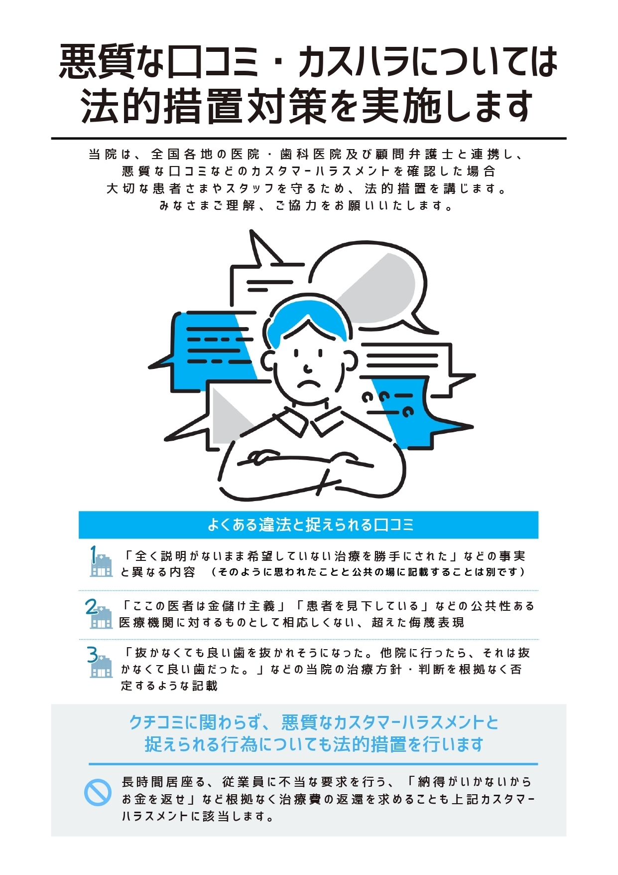 そのため、当院職員や他の来院者への迷惑行為やハラスメントについては、顧問弁護士および所轄の警察と連携のうえ、断固たる姿勢で対応してまいります。